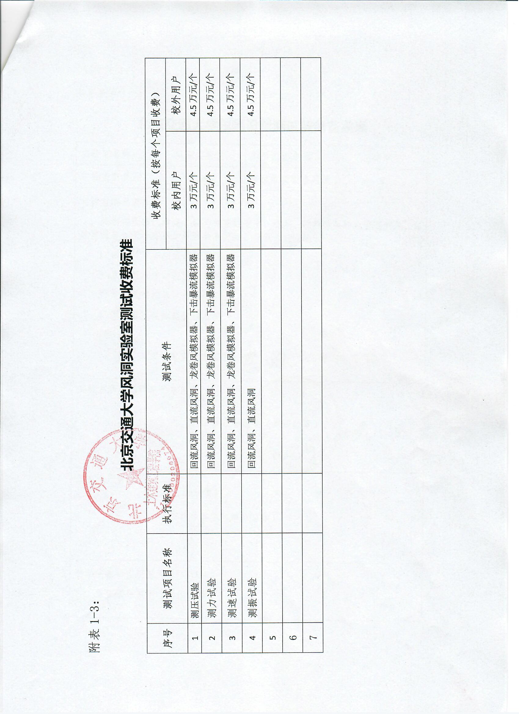 关于北京交通大学风洞实验室测试收费标准的公示